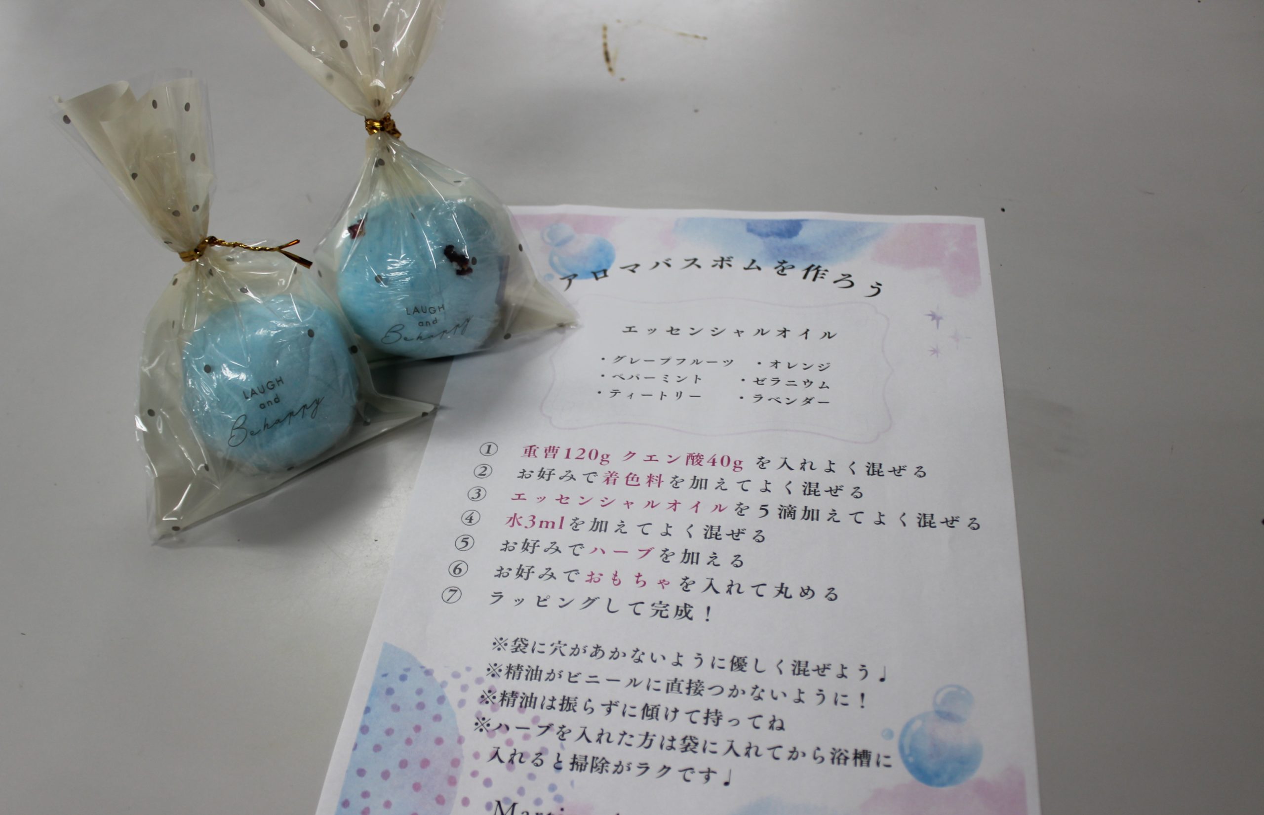 アロマのお話を聞いたり、香りを実際に嗅いでみたりして、自分の好みの香りを見つけ、とても楽しそうな声がたくさん聞こえてきました。2色を混ぜ合わせて素敵な色のバスボムが完成していました。今回は男の子の参加もあり、男女問わず楽しめる講座でした!