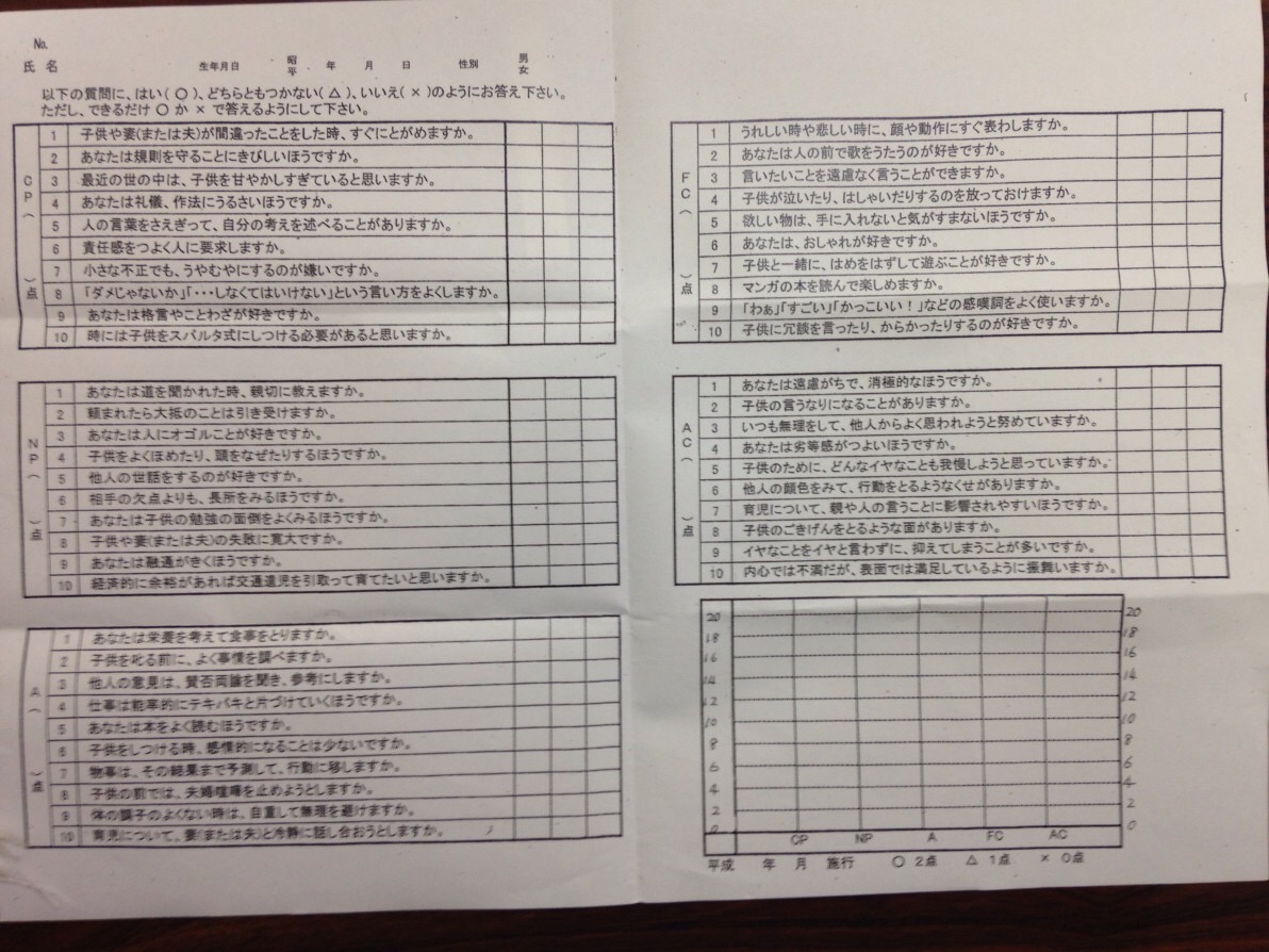 ↑講演会で使ったエゴグラム。○→2点、△→1点、×→0点で採点します。