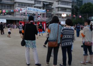 その中の1つ、7月30日(日)に岡山中央小学校校庭にて開催されたサマーフェスティバル弘西では、今年も多くの地域の方々で賑わっていました。輪投げやダーツなどのゲームや夜店では列をなすほどの大盛況でした。大きな輪になって盆踊りを心ゆくまで楽しまれている様子、太鼓など披露している姿に足を止めて見入る様子が伺えました。