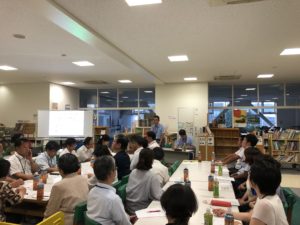 7月20日(金)夏休み初日の午後7〜8時半、地域教育懇談会が岡山中央小学校メディアルームにて開催され、小学校・中学校の先生方、地区の民生委員の方々、小学校・中学校の役員の方々、約50名にお集まりいただきました。
