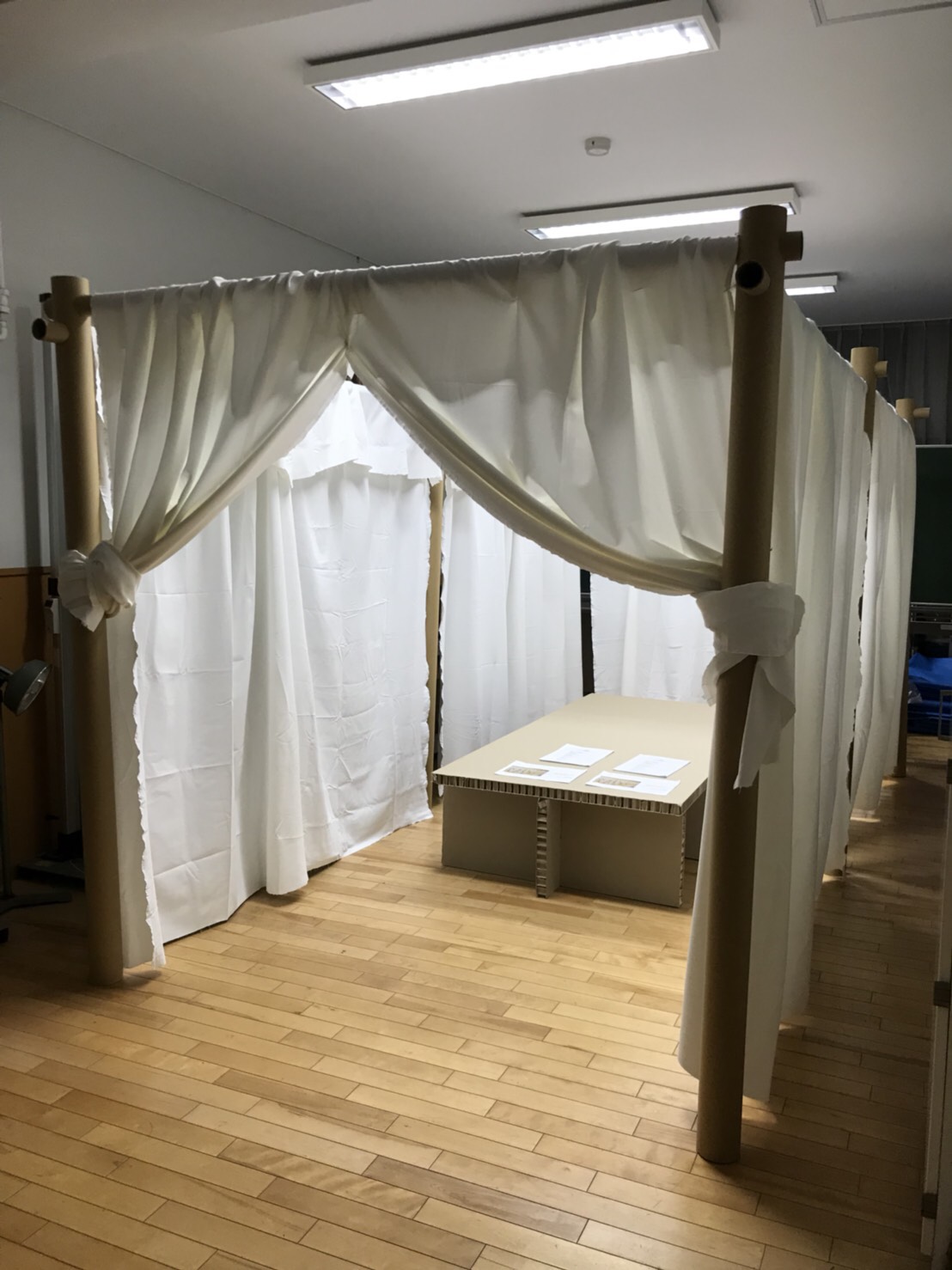 このペーパーパーテーションは、先日の西日本豪雨の避難所や、各地の避難所でのプライバシー保護のために設置されているそうです。