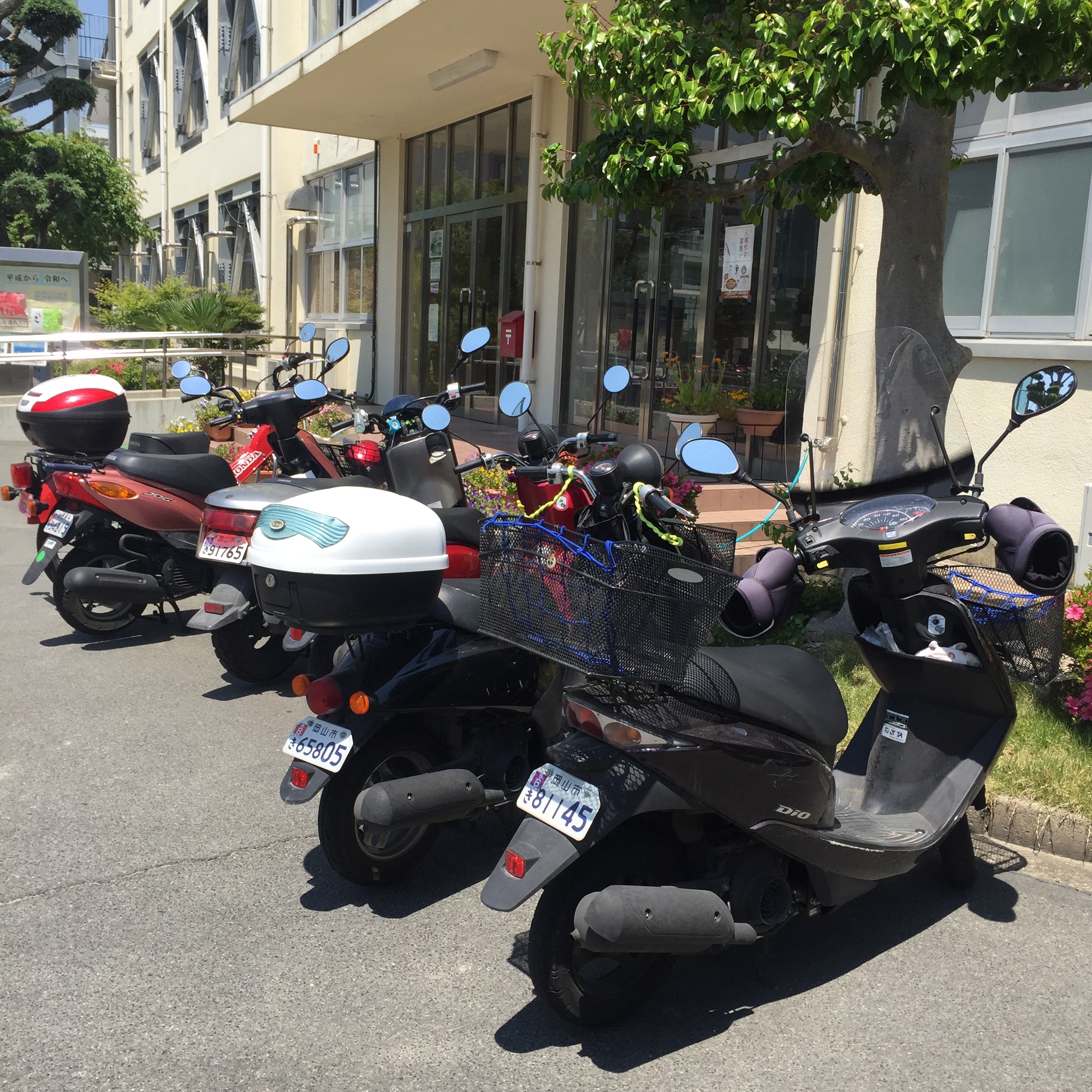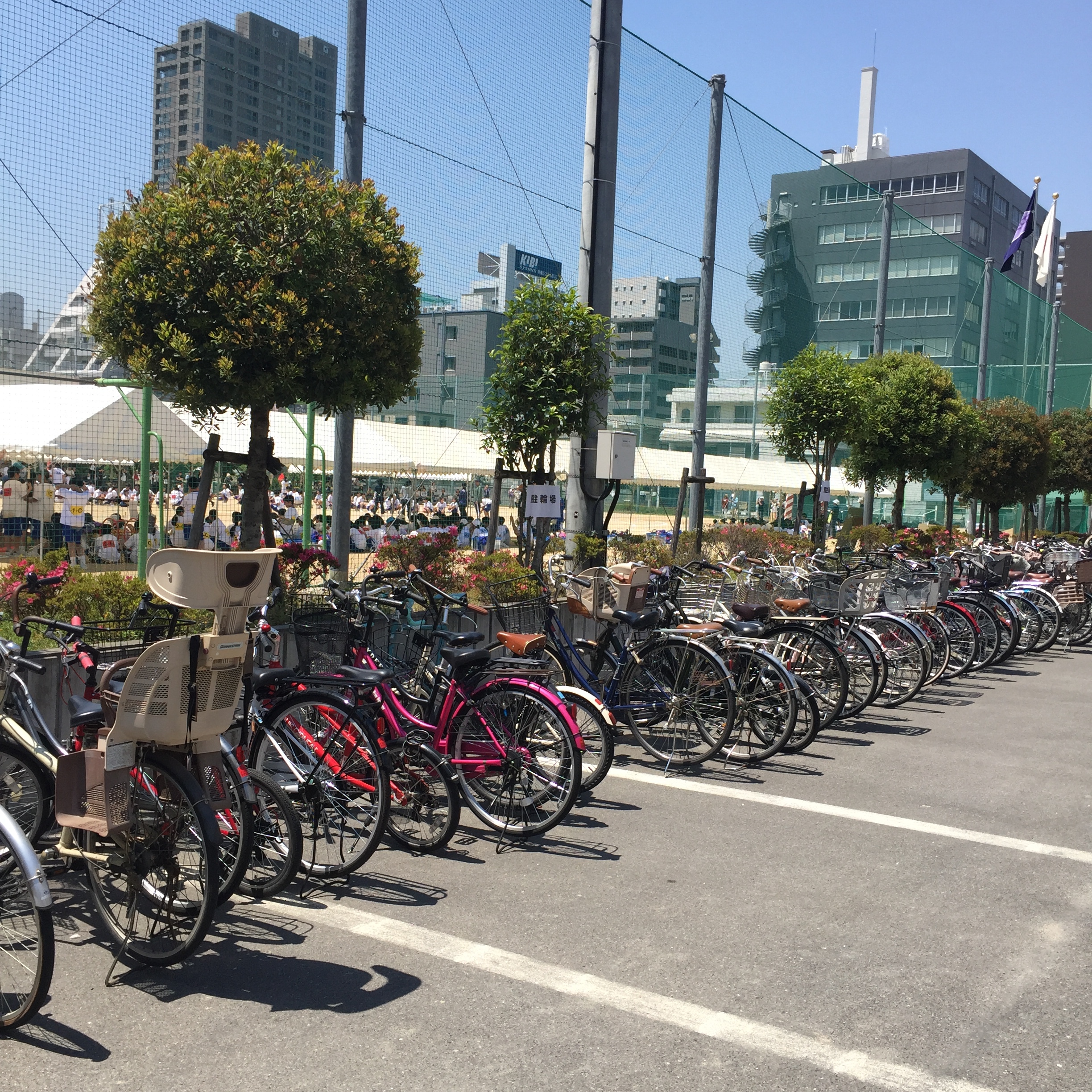 校門を入り右手側にバイクの駐輪場を設けています。校門から奥にかけては、たくさんの自転車が並んでいます。混雑することなくスムーズに作業を行うことができました。