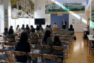 細川副校長:約3年前から本日に至るまでの経緯、当日の内容、生徒からのアンケート結果報告について、Oniビジョンでの放送を報告。