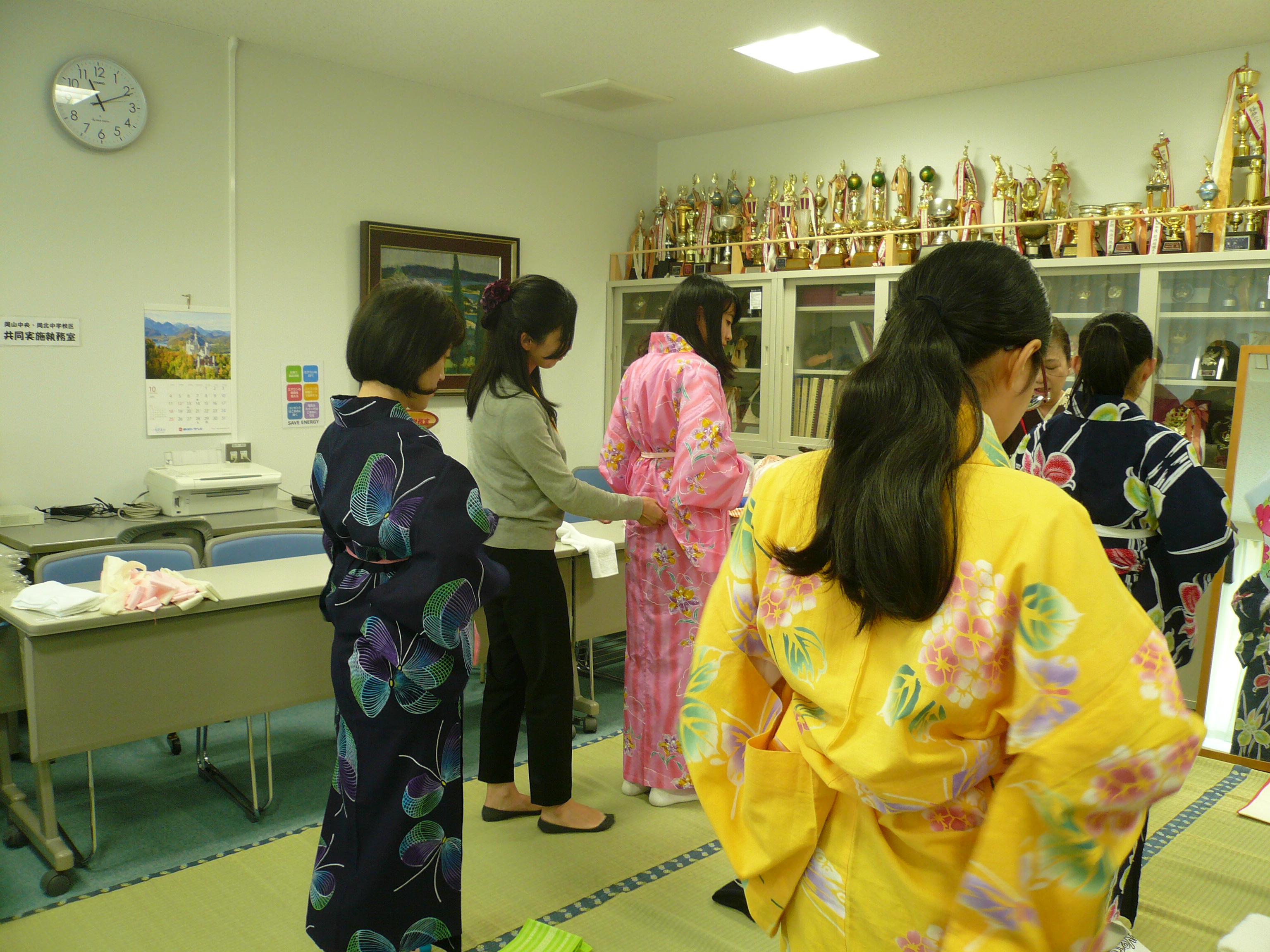 ゆかたの着方教室。好きな柄のゆかたを選んで、華やかです。