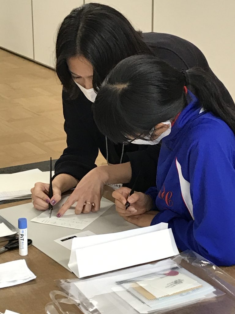 例えばレタリングでは、ペンを横に引くと細い線、縦に引くと太い線、それを上手く組み合わせることで、英語の筆記体がオシャレになる。栞やメッセージカードを、より素敵に出来ます。緩急つける文字の練習を熱心に行う生徒達への指導に、日頃 参観日などでお会いする「保護者の顔」とはまた違う、より一層輝く「プロの顔」を知ることができました。