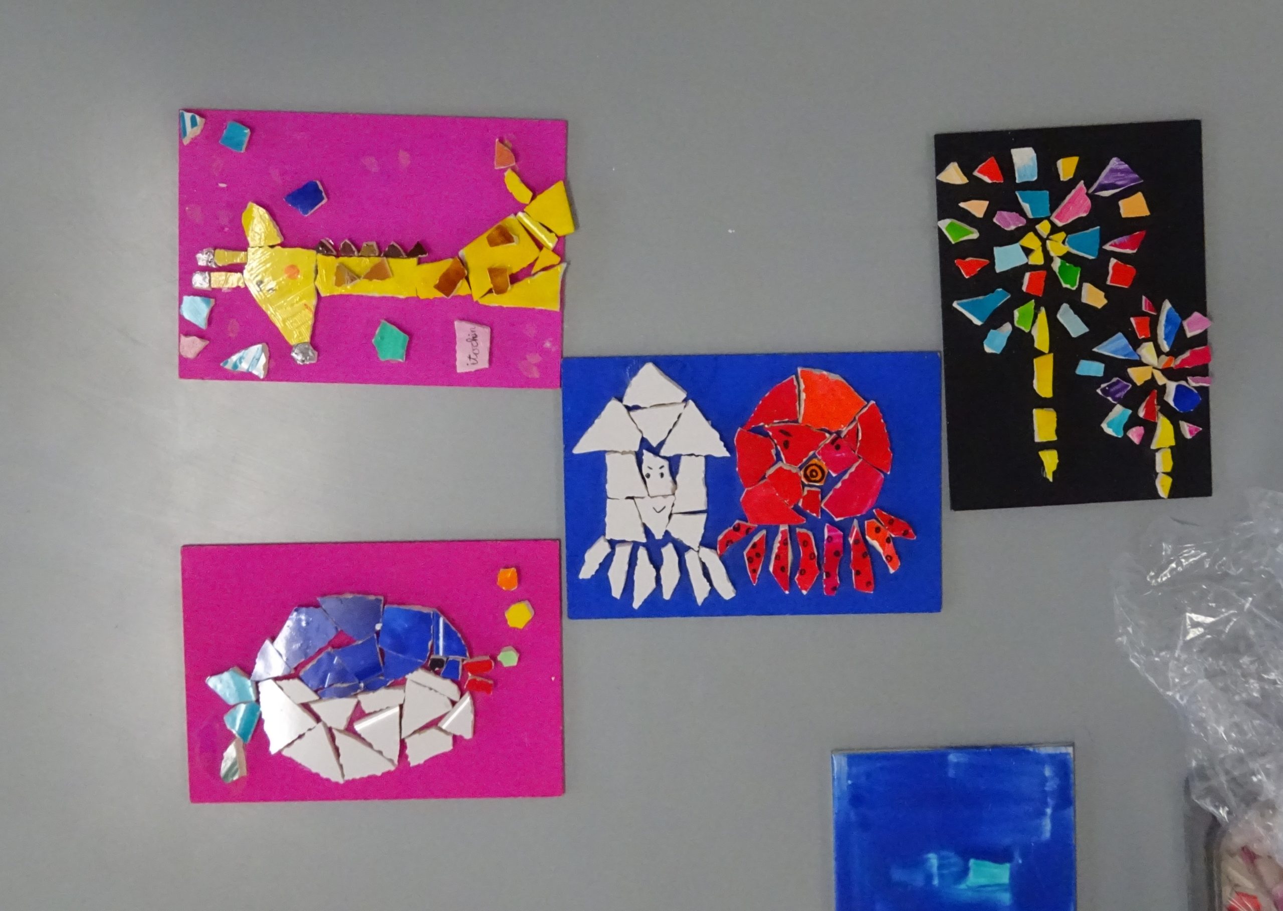 先生からの説明後、用意されたタイルを割り、木のボードにボンドで貼っていきました。