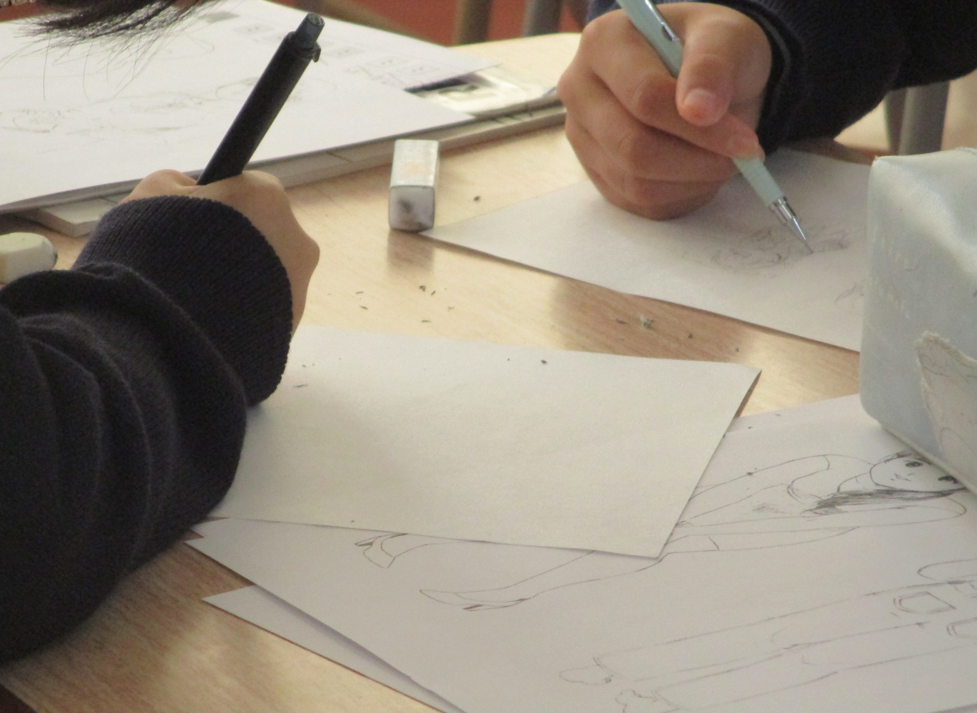 人物の描き方を指、腕、肩、顔、髪等細かいパーツに分けて教えていただきました。生徒たちは、それぞれ習ったパーツを描いたり、自分の作品にアドバイスをもらったりと、楽しく参加をしていました。