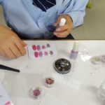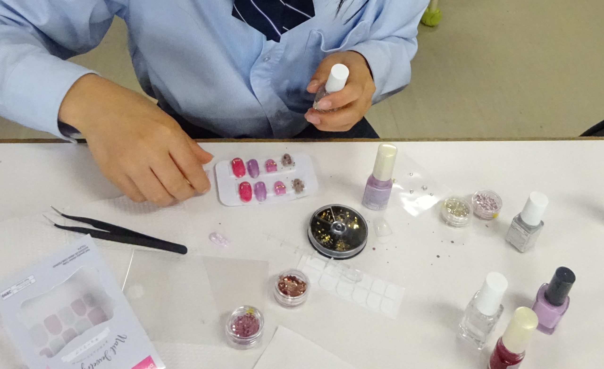 事前に子ども達にネイルチップの長さやデザインを考えてくるように宿題がでていたので、皆んな様々、自分のイメージで自宅にある自分のネイルやデコレーションできるものを持参して、集中して作業していました。