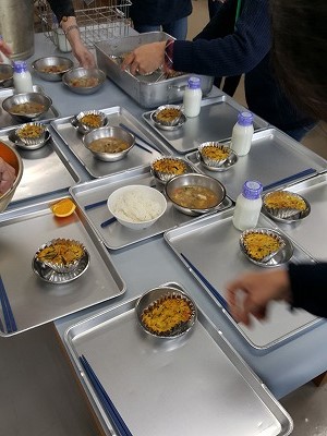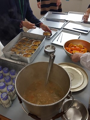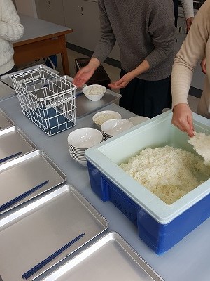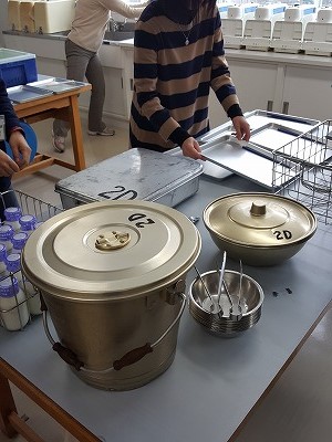 生徒達と同じように給食準備からスタート